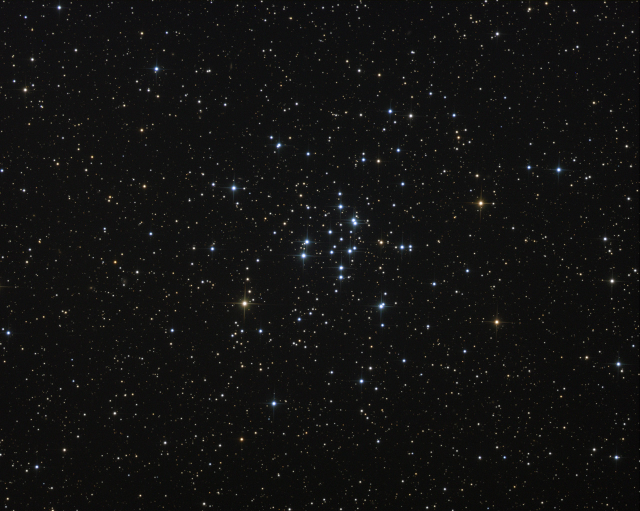 Bei Messier 34 handelt es sich um einen offenen Sternhaufen im Sternbild Pegasus, der etwa 1.400 Lichtjahre von unserem Sonnensystem entfernt ist. Nachdem wir in den letzten Jahren zwischen Weihnachten und Neujahr traditionell immer einen komplett bedeckten Himmel hatten, konnten wir unser Glück dieses Jahr kaum glauben: Nach einem eher durchwachsenen 2016 wurden uns gegen Ende des Jahres noch 3 super klare Astro-Nächte beschert. Eine davon nutzten wir für diesen offenen Sternhaufen. Die Bedingungen waren dabei für unseren Standort absolut exzellent, sodass man auch einen schwierigeres Objekt hätte versuchen können, aber in diesem Falle konnten wir mit den knapp 2 Stunden Belichtungszeit ein tolles Ergebnis erzielen. Die sehr gute Transparenz dieser Nacht wird auch durch die vielen sichtbaren Hintergrundgalaxien, insbesondere im oberen und linken Bildbereich verdeutlicht. Bei diesem Objekt hatten wir uns für Einzelbelichtungen von 2 Minuten entschieden, um die Sternfarben besonders zu bewahren, in dem wir die helleren Sterne mit der kürzeren Belichtungszeit vorm Ausbrennen schützten. Eine absolute Seltenheit war auch, dass wir in dieser Nacht neben dem Foto-Equipment auch noch den 10'' Lightbridge Dobson aufgebaut hatten. So konnten wir während die Aufnahmen hereinkamen das Objekt "live" am Dobson-Teleskop mit unseren eigenen Augen beobachten. Dabei fiel uns am Okular eine markante Sternkombination im Haufen auf, die einem "Strichmännchen" ähnelte. Im fertigen Bild ist diese nur noch schwach zu erahnen, da durch die Bearbeitung die Sternhelligkeiten angeglichen werden und die Figur somit nicht mehr so deutlich heraussticht.
